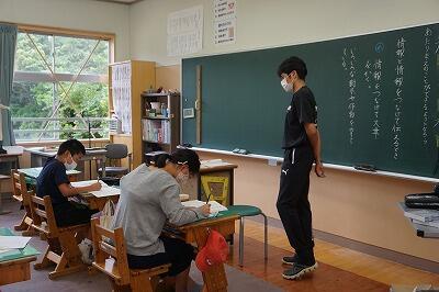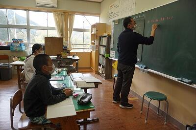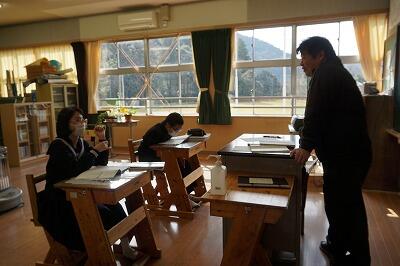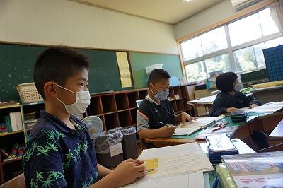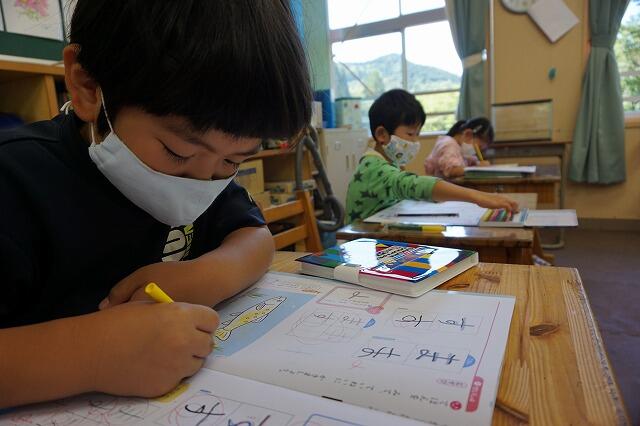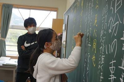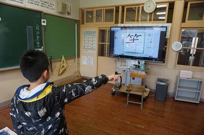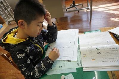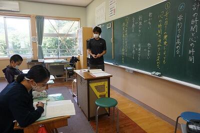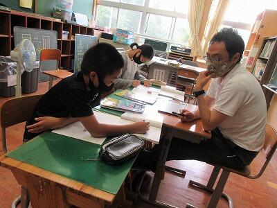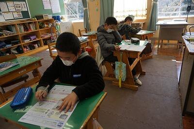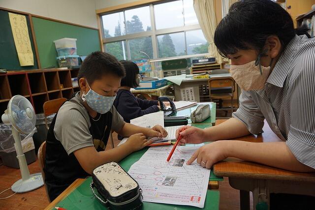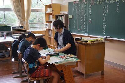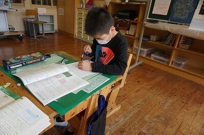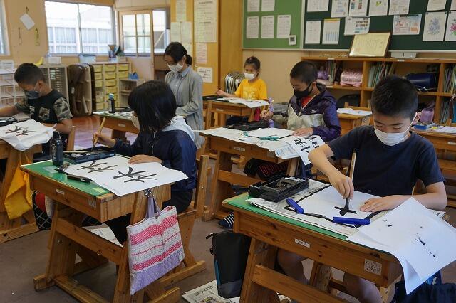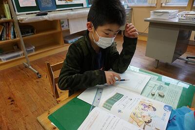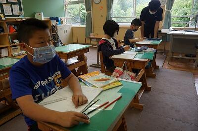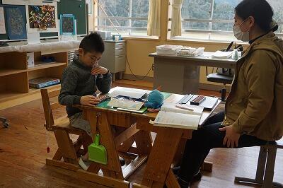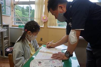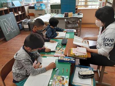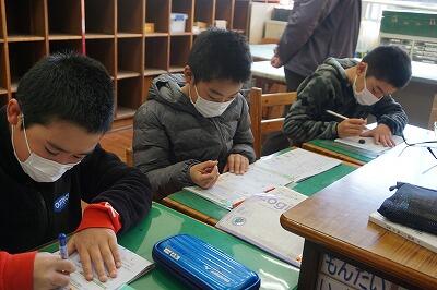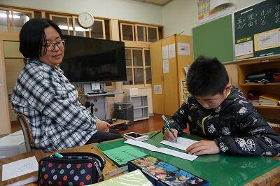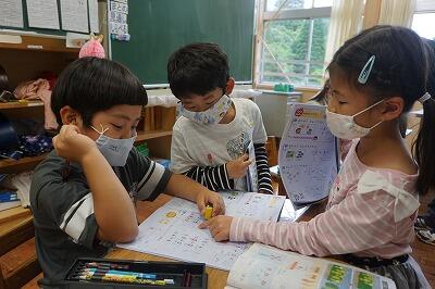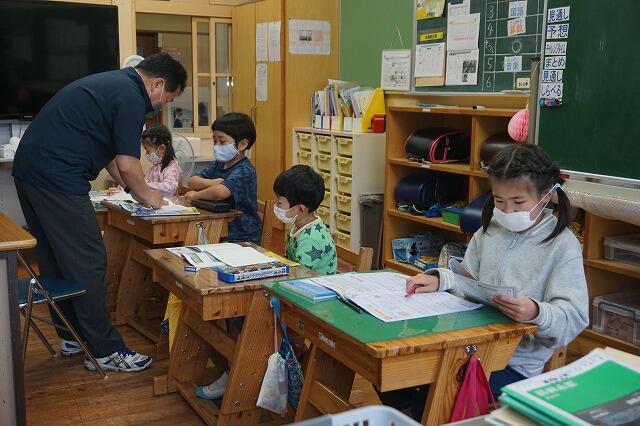 小学1・3年生の国語の授業です。一文字一文字を丁寧に書いています。書き終わった後は、先生に確認してもらいました。褒められて、にこにこのみんなです。