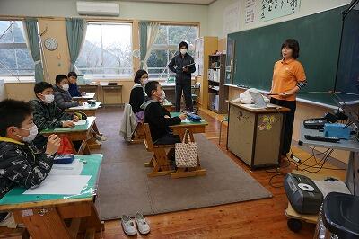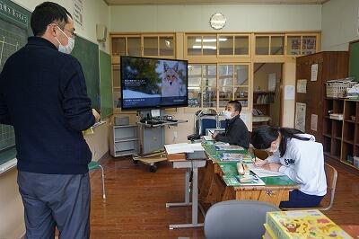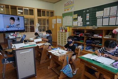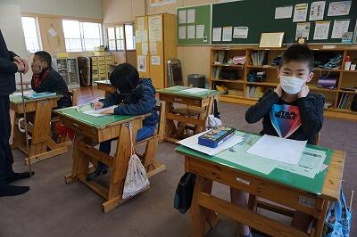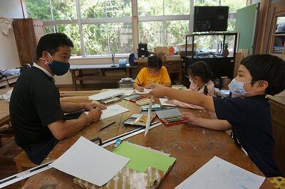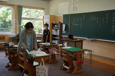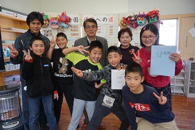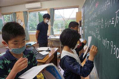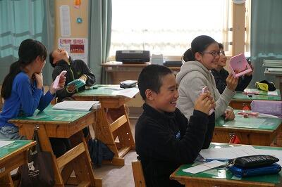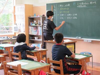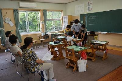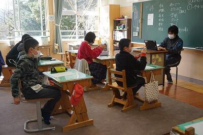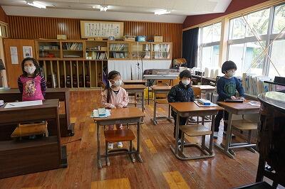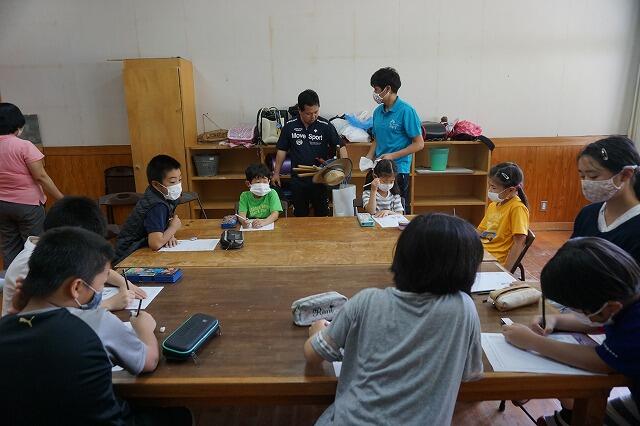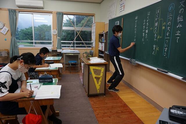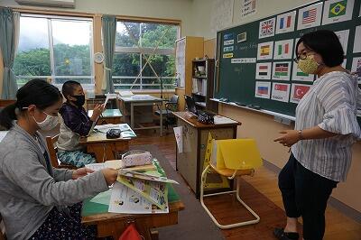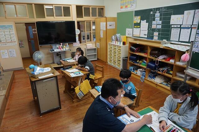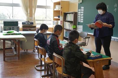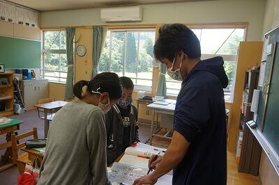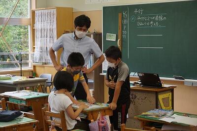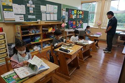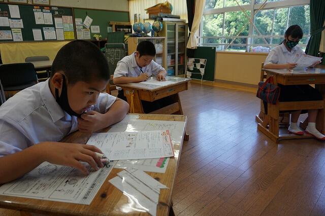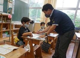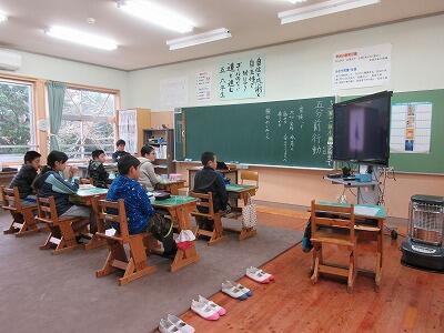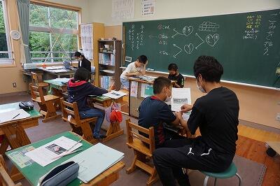小学1・3年生の国語の授業です。一文字一文字を丁寧に書いています。書き終わった後は、先生に確認してもらいました。褒められて、にこにこのみんなです。