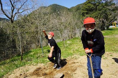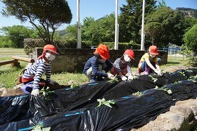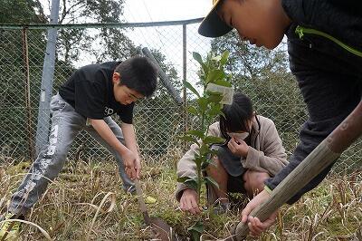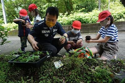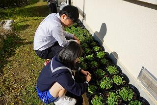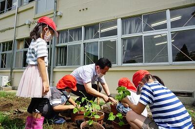 小学1・3年生の生活・理科の授業では、あさがおの支柱を立て、花壇にはアスターとマリーゴールドの植え替えをしました。