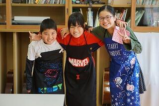 家庭科の授業でエプロンやナップサックを作りました。上手に作ることができたかは笑顔が物語っていますね!