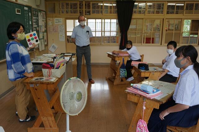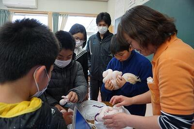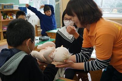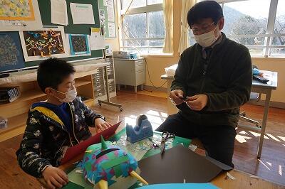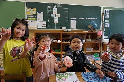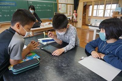 小学1・3年生の図工は、折り紙の作品が完成し、動物の絵を描きました。