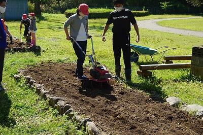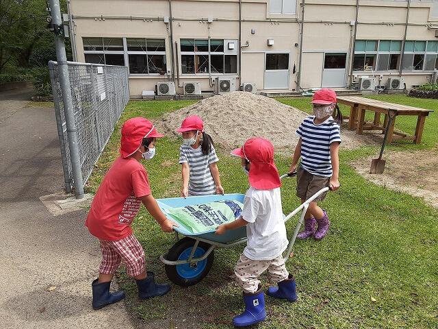 一輪車で重い堆肥を運ぶときは全員で協力して荷物を運んでいました。