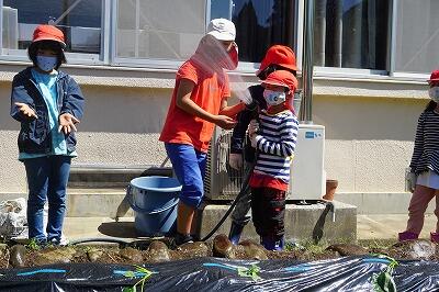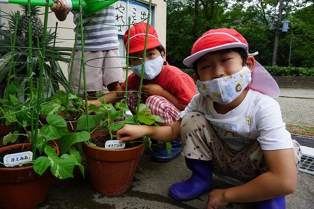 自分たちで植えたあさがおに水やりをしている様子です。緑の立派なつるがぐんぐん伸びてきています。早くきれいな花が咲くといいですね。
