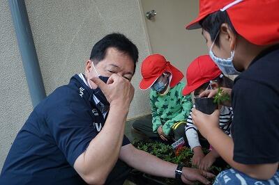 あさがおの葉が、自分たちたちの手のひらよりも大きくなっているのに感動する子どもたち。