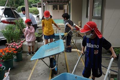 赤とピンクのサンパチェンスという花の植え替えをしている様子です。小さな体でバランスを取りながら、大きな一輪車を一生懸命押しています。