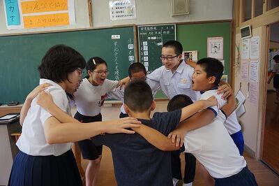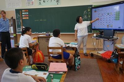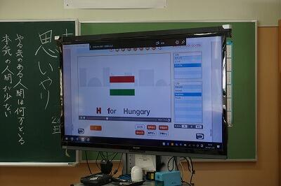 小学生はALTのスミス先生と外国語の授業で、アルファベットの頭文字に当てはまる国名をリズムに合わせて楽しく発声していました。
