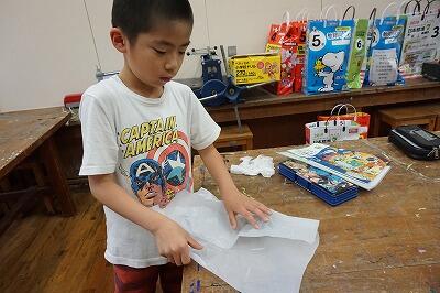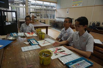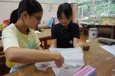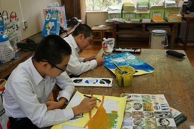 小学生は先日下地づくりをした色版画の印刷を行っていました。色を重ねることでおもしろい絵や模様ができあがるのだそうです。仕上がりまでもう少しです。