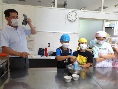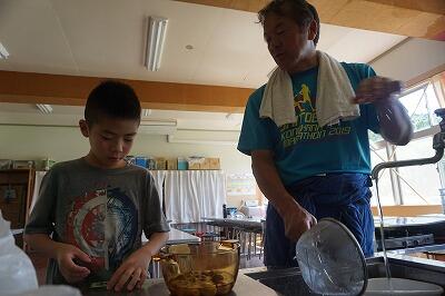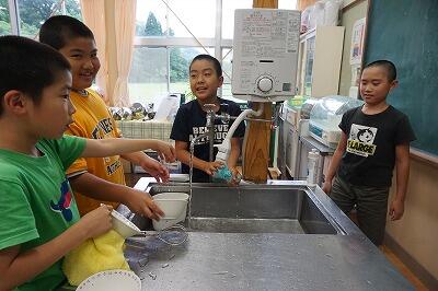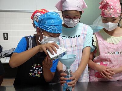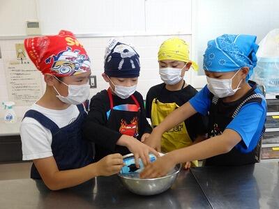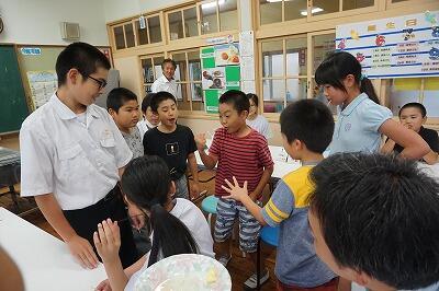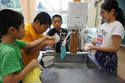 ランチルームでは、小学生が調理実習の事前準備中です。