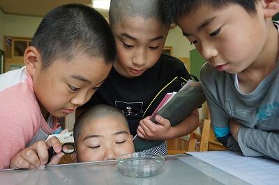 小学校3年生の教室では、メダカが卵からかえっていました。