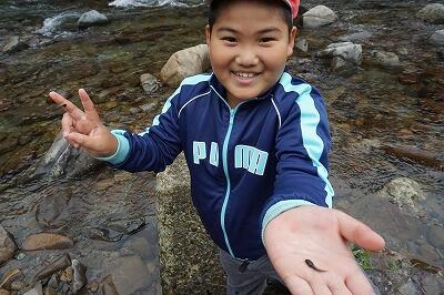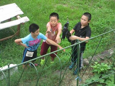 途中、かえるややもりをみつけてうれしそうに捕まえていました。
