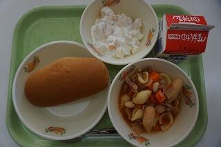 黒糖パン、牛乳、ミネストローネ、クリームあえ