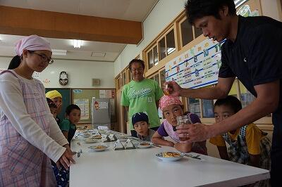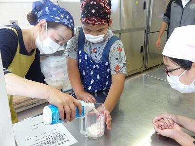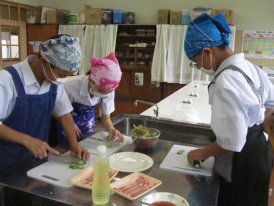 ランチルームでは、小学生が調理実習の事前準備中です。
