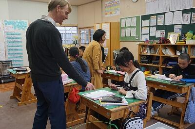 小学生はALTのスミス先生と外国語の授業で、アルファベットの頭文字に当てはまる国名をリズムに合わせて楽しく発声していました。