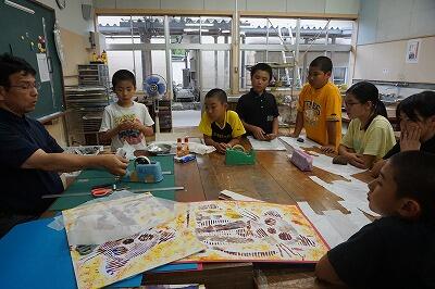 小学生は先日下地づくりをした色版画の印刷を行っていました。色を重ねることでおもしろい絵や模様ができあがるのだそうです。仕上がりまでもう少しです。