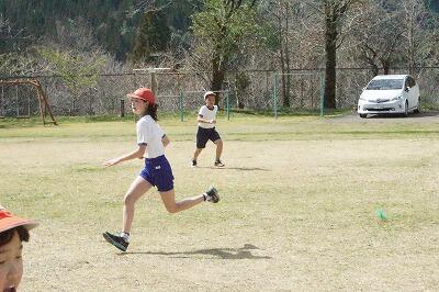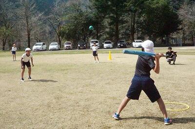 体育の時間、小学生は「Tボール」をしました。お互いに声を掛け合いながら、試合を楽しんでいました。