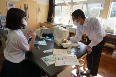 中学2年生の家庭科の学習です。ミシンを使っての作品作りに取り組んでいました。ミシンの扱いに戸惑っている様子もありましたが、お互いに協力し合っていました。