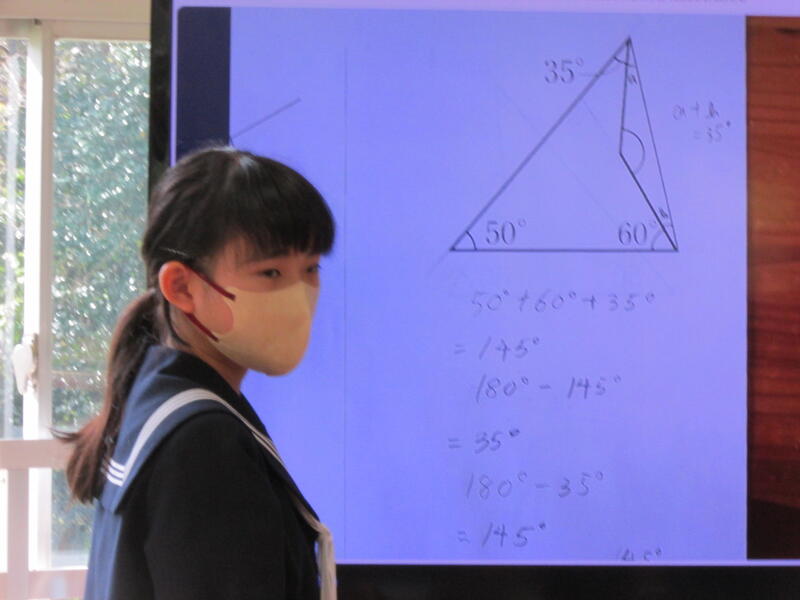 中2の数学です。矢じり型の角度を求める問題で、解法の説明をみんなで共有しました。