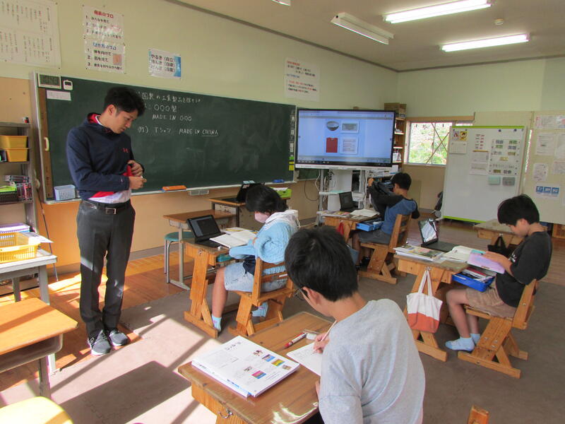 小5の社会です。外国製の工業製品を学校の中で探しました。着ている服や文房具・機械類などの多くが外国で作られていることが分かりました。