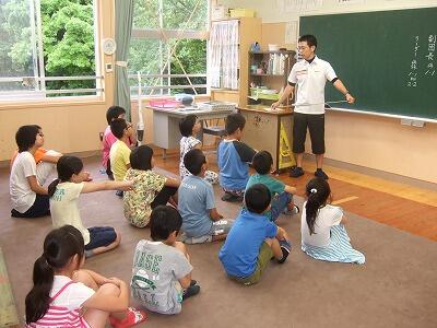 今日は釣り名人の濱砂孝義氏が1・3・4年生に国語の授業でウナギ針の仕掛け方や銀鏡川にいる生き物などについてのお話をしてくださいました。子供たちは興味津々で聞きながら、上手にメモをとっていました。これをこれから、レポート作りや新聞作りに生かしていきます。