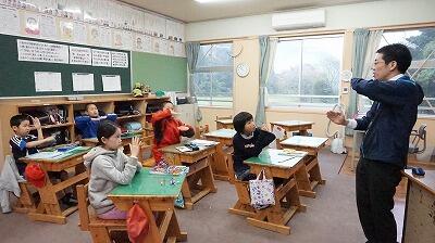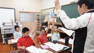 5・6年生の算数の授業です。中学校の先生も乗り入れ授業で教えてくださっています。体を使って覚えたり、みんなで発表し合ったりと楽しい授業が展開されていました。