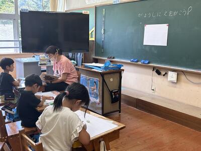 小学1・2年生の図工では、読書感想画の制作を進めました。画用紙に、何をどのように描いていくのか、絵の構成を考えていきました。
