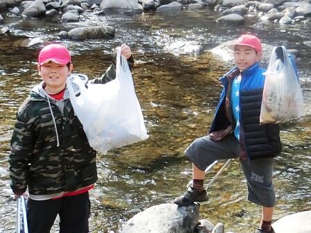 鴨川に習い川の美化活動です。子ども達はすすんでごみを見つけ、こんなに拾うことができました。