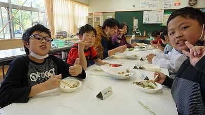 子どもたちは、山菜のいい香りと味を幸せそうな表情で味わっていました。