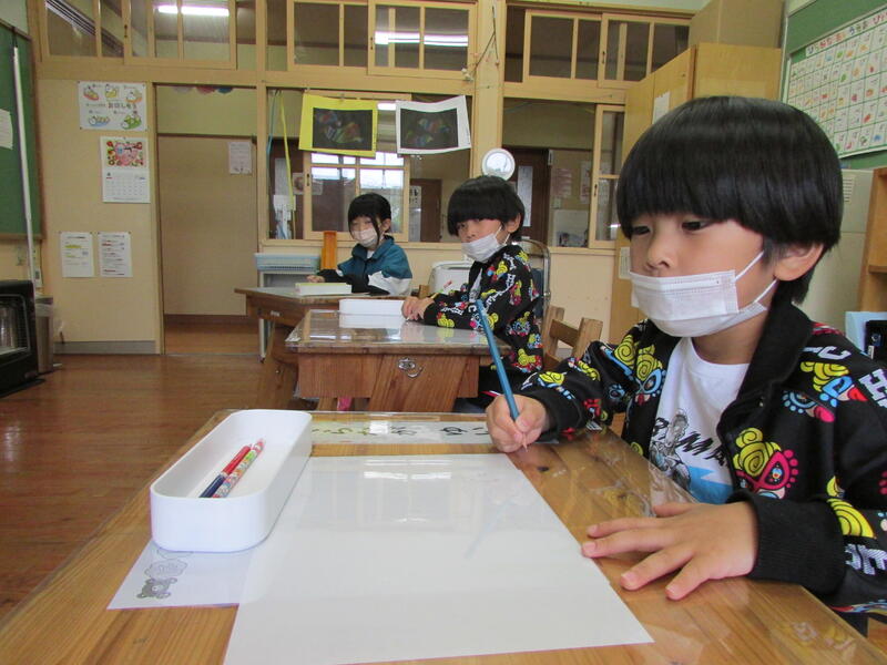 小学1、2年生の書写の授業。初めての書写。鉛筆の正しい握り方と正しい姿勢を確認しながら数字や点線をなぞりました。はみ出さないように気を付けていました。