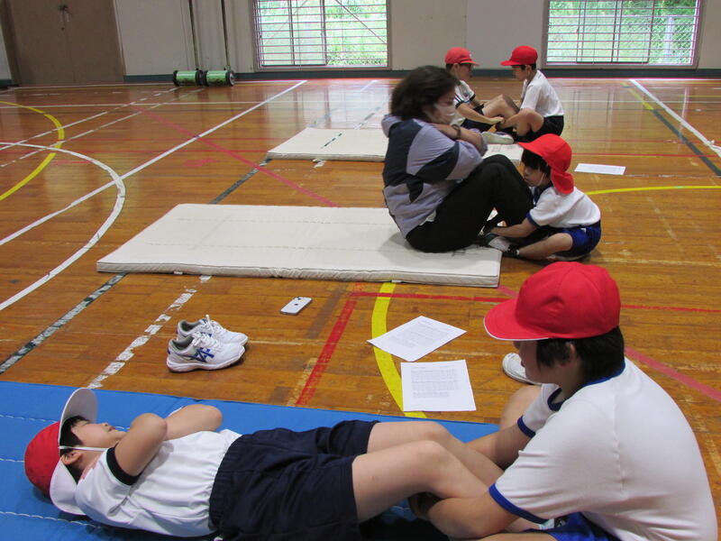 小学生の体育の授業です。新体力テストの練習をしました。本番は5月後半です。上体起こしにチャレンジ。各学年の数値目標に向かってみんな努力していました。