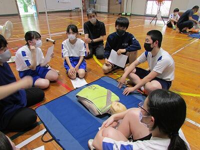 中学生は圧迫交代のタイミングも練習していました。呼吸を合わせて「3.2.1」のタイミングで交代し、なるべく中断しないように気を付けることができました。