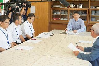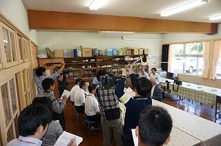 はじめに山村留学について甲斐公成会長と濵砂孝義実行委員長が本地区の留学制度について説明をされました。そして宮元校長先生が、本校の児童生徒の様子や留学制度と関連した取組について説明しました。説明をお聞きになった河野知事からは、今後も山村留学制度のよさを生かして、地域の活性を図り、よりよい教育活動の充実に努めてもらいたい、地域活性をはかる山村留学制度について、県でもPR等協力できることは行っていきたいといったことばをいただきました。
