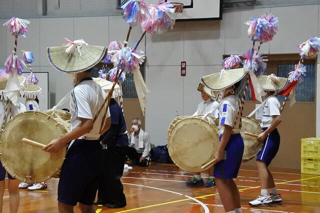 中学生の臼太鼓踊りの練習の様子です。太鼓の重みに耐えつつ、全員の息を合わせて丁寧に踊っていました。運動会で目にするのが楽しみですね。