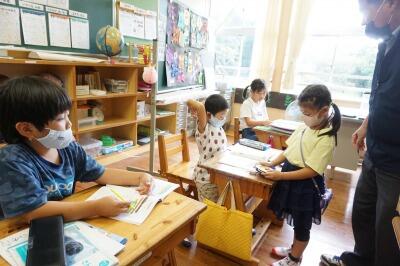 小学1・3年生の算数の授業です。1年生は時計の模型を使って、問題を解いたり、友達の問題を出してみたりと自分で考えて学習していました。3年生は、コンパスを使っていくつもの円を書いていました。コンパスの使い方が上手です。