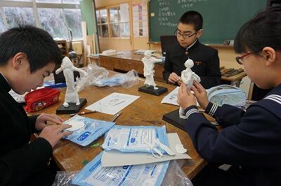 今日は、美術もありました。1年生は、粘土で銀鏡のキャラクターの制作、3年生は、できあがった型に石膏を流し込みました。