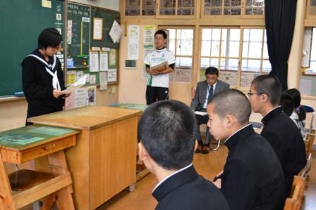 今朝の集会、小学4年生は文化祭・中学1年生は福祉体験活動の作文発表がありました。
