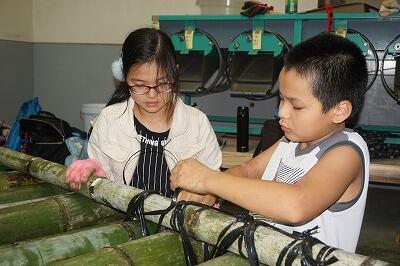 太い竹をのこぎりで切り分けたり、 ビニールテープでつなぎ合わせたり、みんなで協力して完成させることができました。