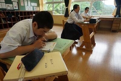 中学3年生は数学の学習をしていました。分からないところは要所要所丁寧に分かるまで担当の先生が教えてくださっています。少ない人数のメリットですね。