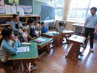 56年生は外国語活動で英語の発音を学習。中学校の英語の先生と