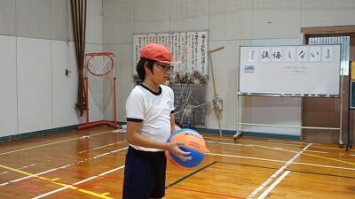 小学生の体育の様子です。バスケットボール競技のオリエンテーションを行いました。いろいろな投げ方やドリブルの仕方を身に付け、力一杯のシュートが決まるようになるといいですね。