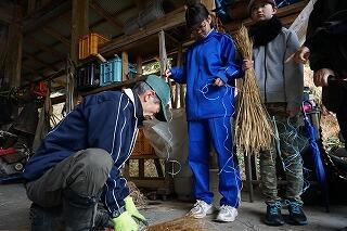 続いてもぐら打ち棒作り。わらをきれいに整えて、棒の先に結わえていきますが、なかなか上手くはいきません。大人