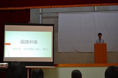 国語弁論では、中学3年の生徒が「推し、燃ゆ」を読んで考えたことを発表しました。自分の意見をしっかり発表する姿が頼もしく感じました。