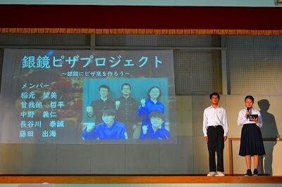 中3生徒によるさいと学アワードの発表です。銀鏡の柚子胡椒や柚子みそを使って試作したピザも、とってもおいしそうでした。