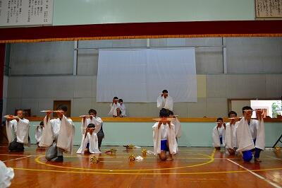 小中学生男子による神楽「花の舞」の発表です。地域の方とともに見事な神楽を披露しました。