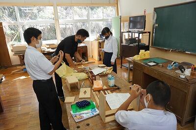 中学1年生は、技術の授業で本棚つくりに挑戦しています。設計図通りに板を切り出したり、釘を打ったりするのが難しそうでしたが、一生懸命頑張っていました。