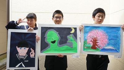 これは銀鏡の桜を描いたのでしょうか。中学1年生が美術の時間に仕上げた作品です。それぞれの個性が表れていて面白いですね!