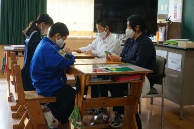 中学3年生の英語の授業では、問題プリントに集中して取り組んでいました。今、3年生が作成した英作文が廊下に掲示してあります。頑張っています。