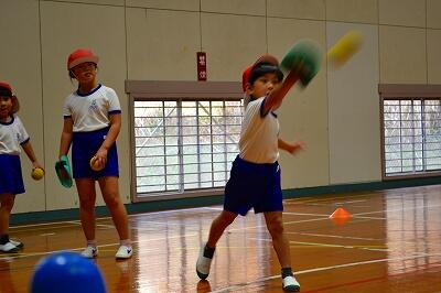 小学校1,2年生の体育です。ラケットを使って強く速いボールを打つためにはどうすればよいか、を考えながら練習をしました。だんだんと自分の理想とするフォームに近づいていきました。