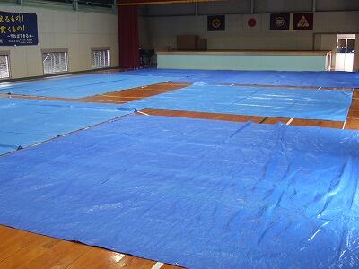 今日は川遊びで使ったブルーシートをきれいにしました。中学校の先生方は2学期の生徒会に向けての話を行いました。