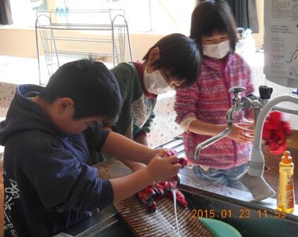 小学3・4年生の社会科で昔の暮らしを体験しました。洗濯板を使ってのお洗濯です。