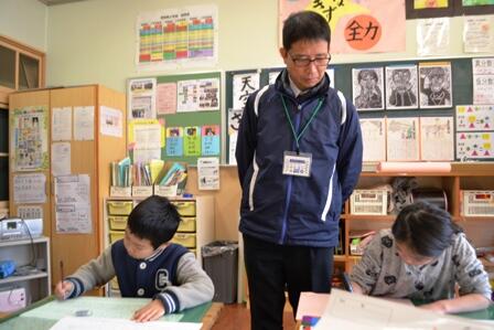 学習発表会の練習をしています。この写真は町探検の様子でしょうか。